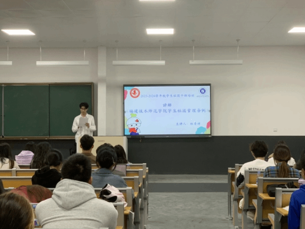 为促进社团健康有序发展,提升社团活力,11月8日下午,校学生社团管理部在五马山校区弘毅苑举办2023年学生社团干部培训班。全体学生社团会长们参加了此次活动。