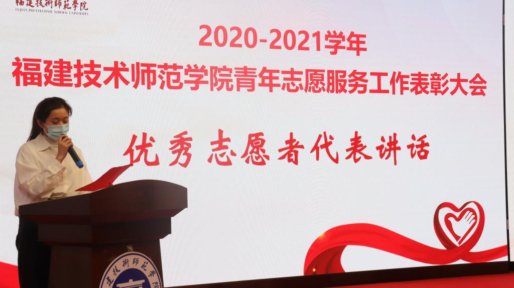 优秀志愿者代表吴尘雨同学发表感言。她认为青年志愿者不仅仅是一名志愿服务工作者,更是一名被服务者,它存在的意义就是给身边的人们带来便利,带来帮助,带来爱与关怀;做好志愿服务工作不仅需要兴趣与热情,更需要坚持与坚守。