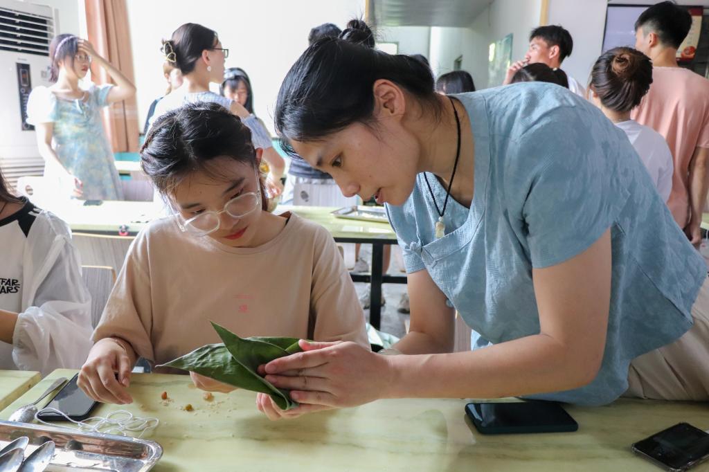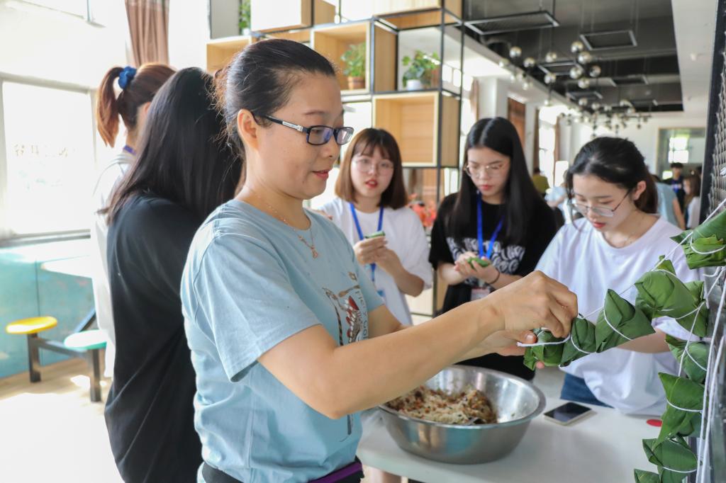 在端午“粽”动员活动现场,来自三个学院的一百多名学生代表参加包粽子比赛,他们将亲手包好煮熟包的粽子送给老师同学们以及学校后勤和安保工作人员,以表达最真挚的祝福。