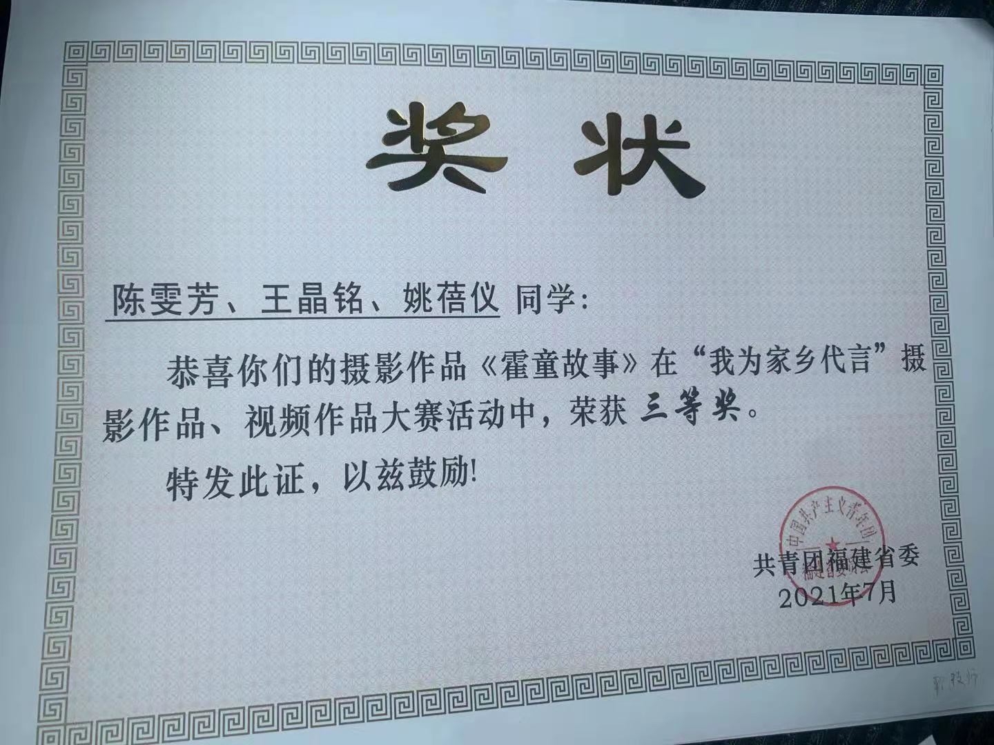 日前,我校学生在福建省大中专学生志愿者寒假“三下 乡”社会实践活动暨“我为家乡代言” 摄影作品、视频作品大赛中获佳绩。其中,文法传媒与法律学院2020级陈雯芳同学的摄影作品《霍童故事》获得三等奖,指导老师为王彦;文法传媒与法律学院2020级江婉瑄同学的摄影作品《洪坑之眼》获得优秀奖,指导老师为蒋潇洋。王彦老师获得优秀指导教师奖。