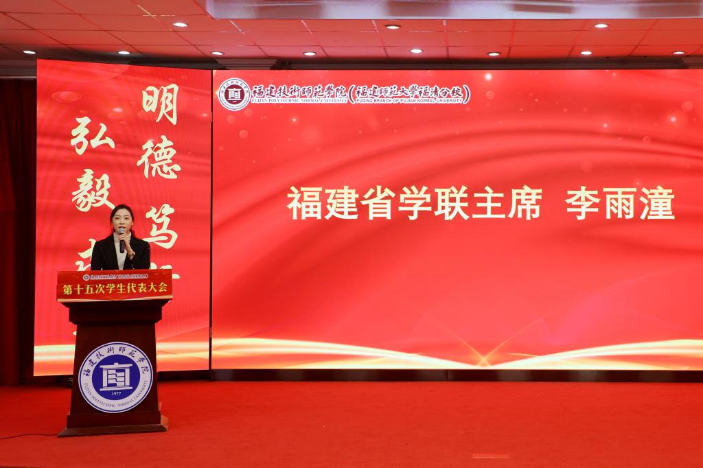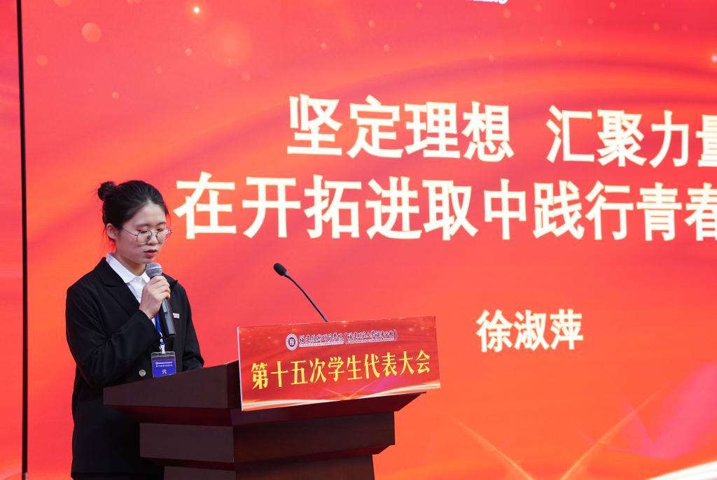 李雨潼主席代表省学联,向大会的召开致以热烈的祝贺,并充分肯定了我校学生会的工作成效。她指出,此次大会的召开,是学校认真落实学生会组织改革的重要举措,是对第十四次学生代表大会以来各项工作的全面总结,为今后学生会持续深化改革和健康发展指引了方向。她希望我校学生会组织筑牢理想信念根基,展现强国有我的新面貌;发挥桥梁纽带作用,迈出服务同学的新步伐;深化体制机制改革,打造本领过硬的新团队,以本次大会的召开为新的起点,不忘初心、砥砺前行,团结带领广大青年学生在全方位推进高质量发展中贡献青春力量。