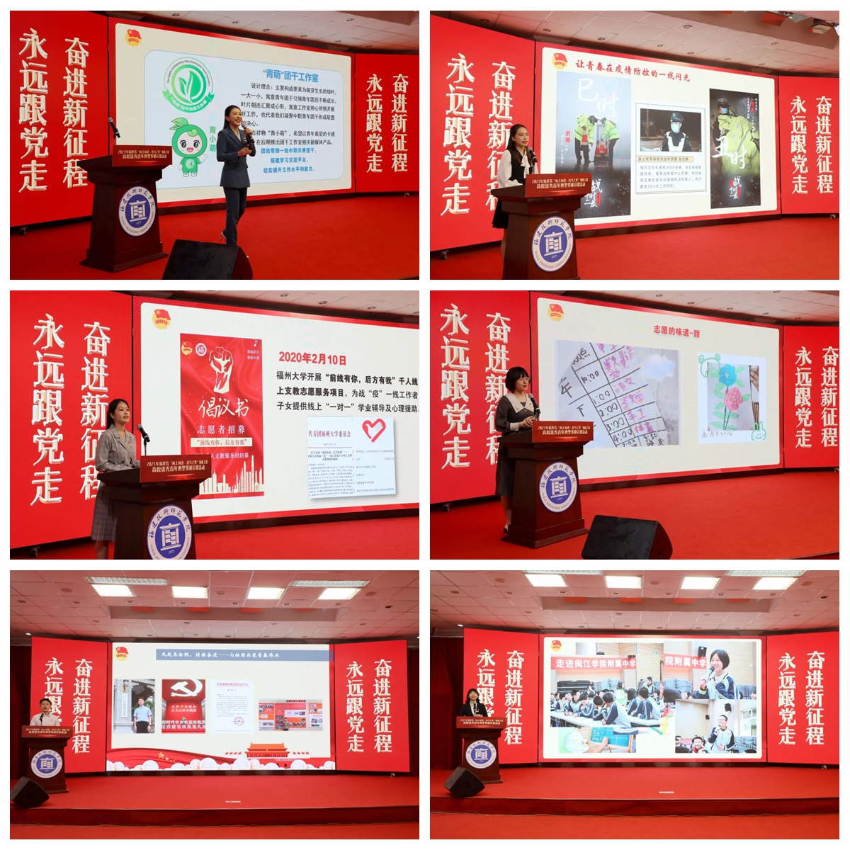 来自福州大学的俞悦、福建师范大学的苏弘戬、福建农林大学的何政彤、闽江学院的叶晓灵和我校食品与生物工程学院的余玥等5位“向上向善育人工程基金”奖教金获得者同学和福建省第二批“学校团干名师工作室”代表、我校团委董林老师用生动的故事、真情实感的表达,讲述了自身对“向上向善”的理解,表达了对“向上向善”的不懈追求。