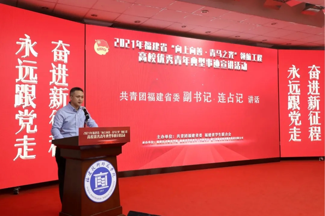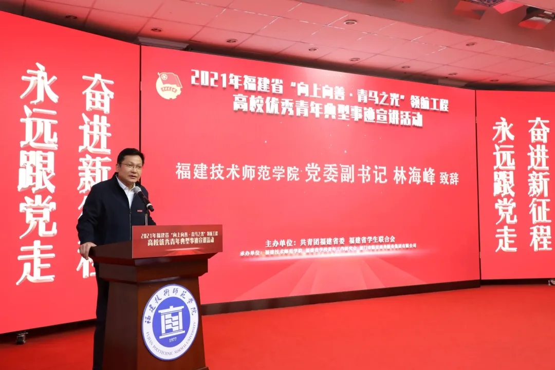 12月15日,由共青团福建省委、福建省学生联合会主办的2021年福建省“向上向善·青马之光”领航工程高校优秀青年典型事迹宣讲活动在我校举办。团省委副书记连占记,厦门市临家商务服务集团有限公司董事长、我校客座教授邱尚振,临家餐饮教育中心院长李娜,校党委副书记林海峰、副校长陈志勇,团省委学校部、福清市团市委负责人,以及我校改革与发展委员会成员、宣传部、学生工作部、教师工作部、校团委和各学院团委负责人,福州大学、福建师范大学、福建农林大学、闽江学院和我校的青年代表、校“青马工程”骨干培训班成员参加了活动。